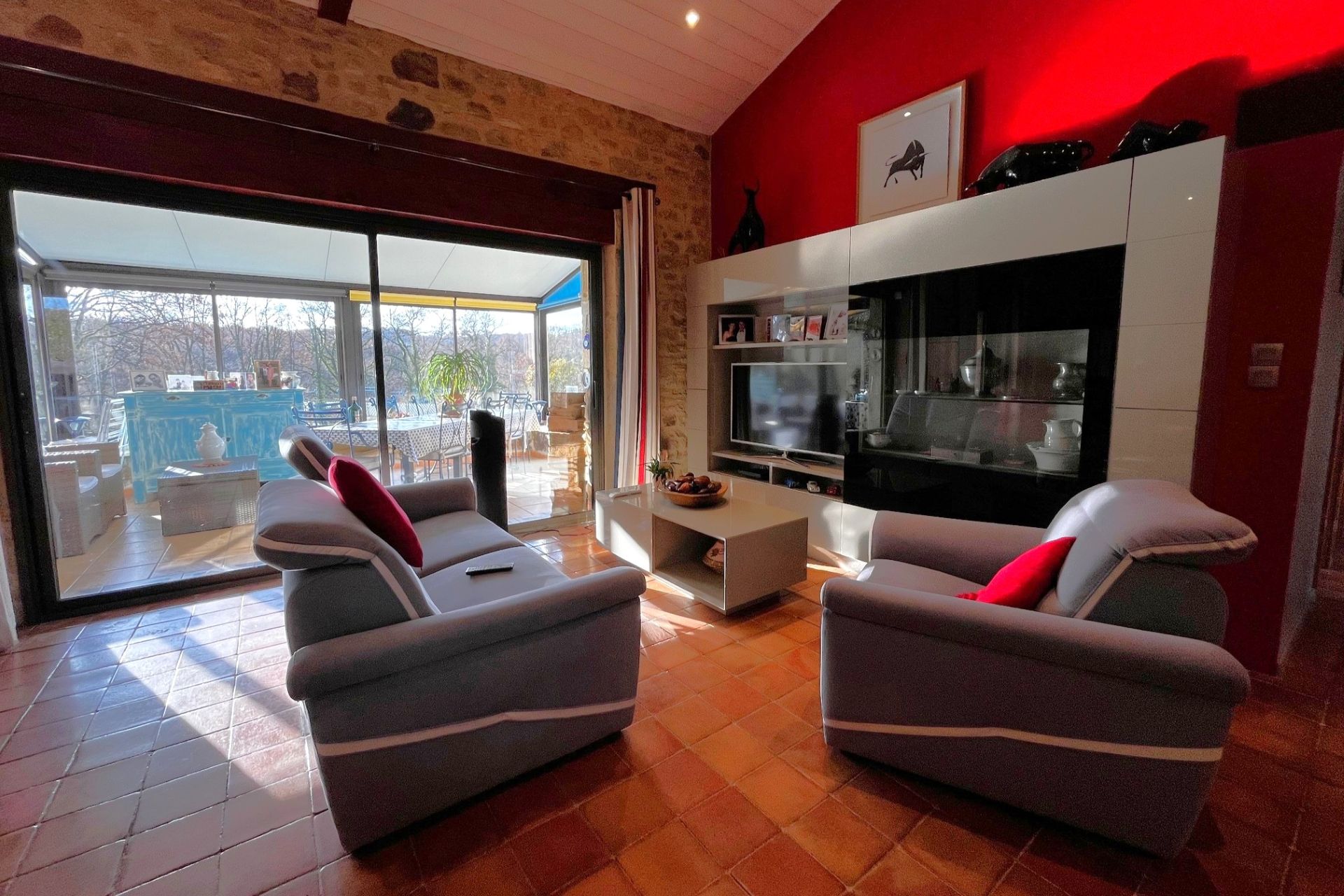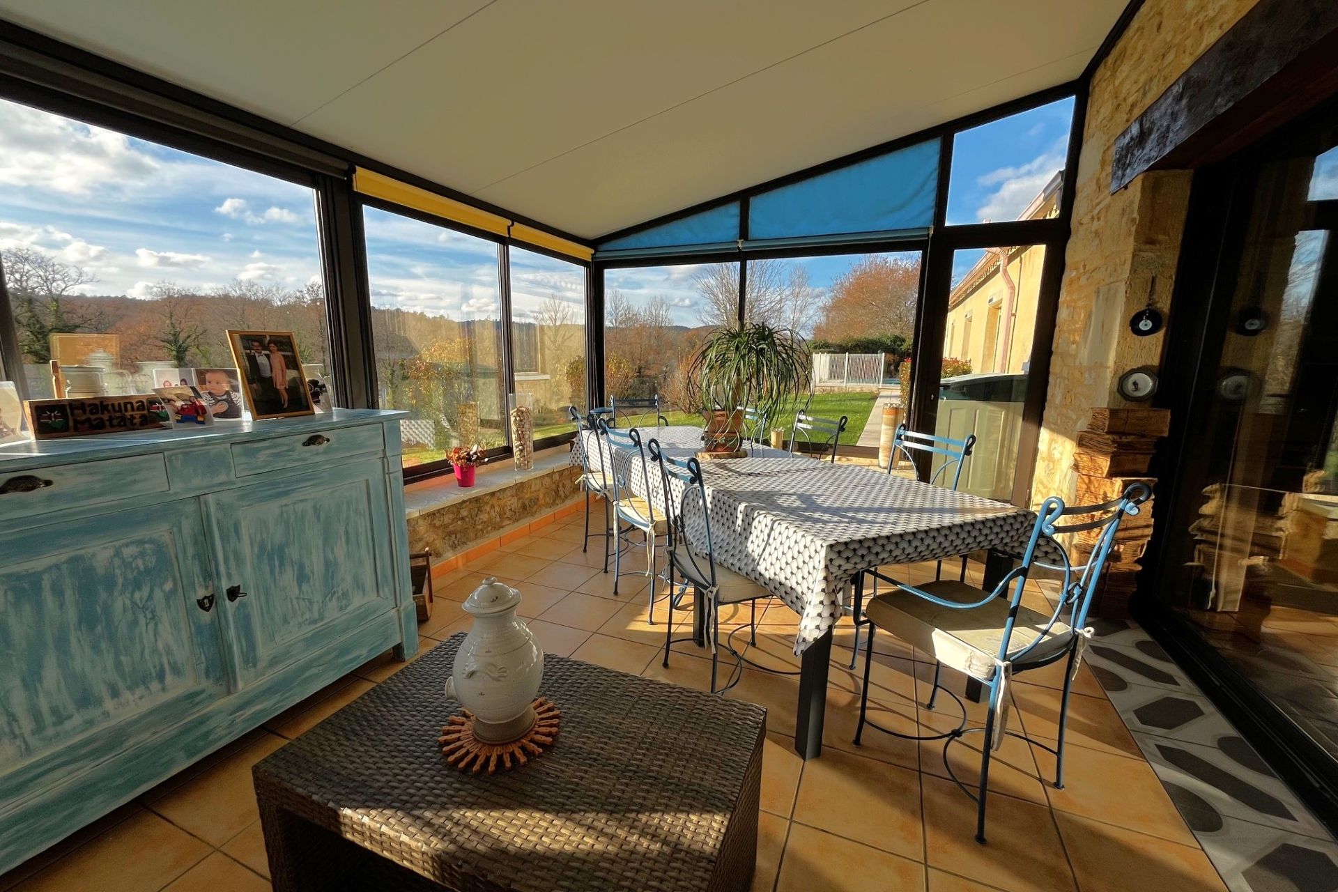 Véranda (5 m²), pièce de vie (50 m²), seconde véranda (14 m²), couloir (16 m²), salle d’eau (8 m²), chambre 1, 2 et 3 (9,5 m²) chacune, chambre parentale avec dressing et salle d’eau (15,5 m²), buanderie dans pigeonnier (8 m²) et à l’étage une pièce de (8 m²).