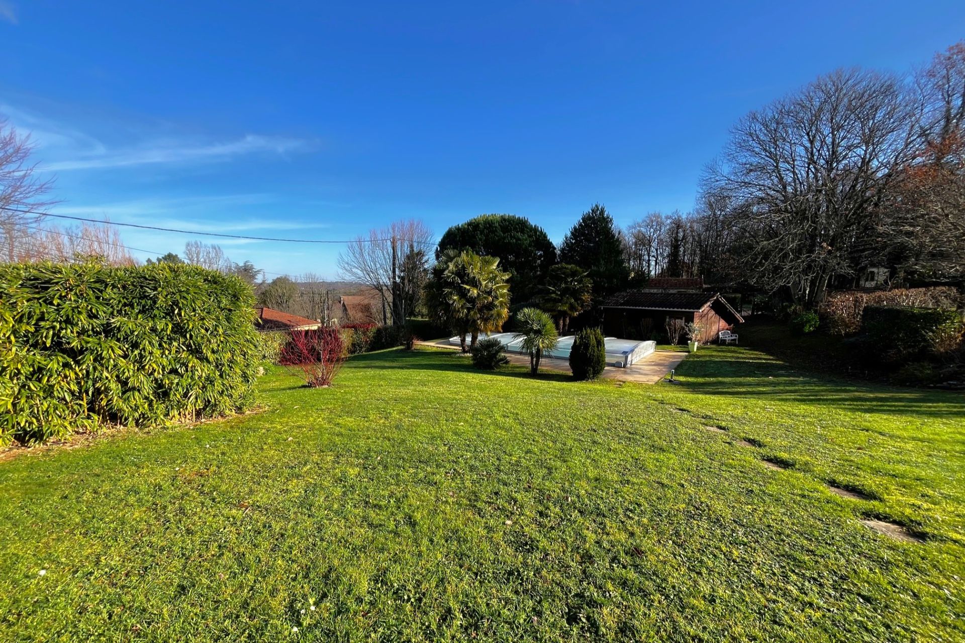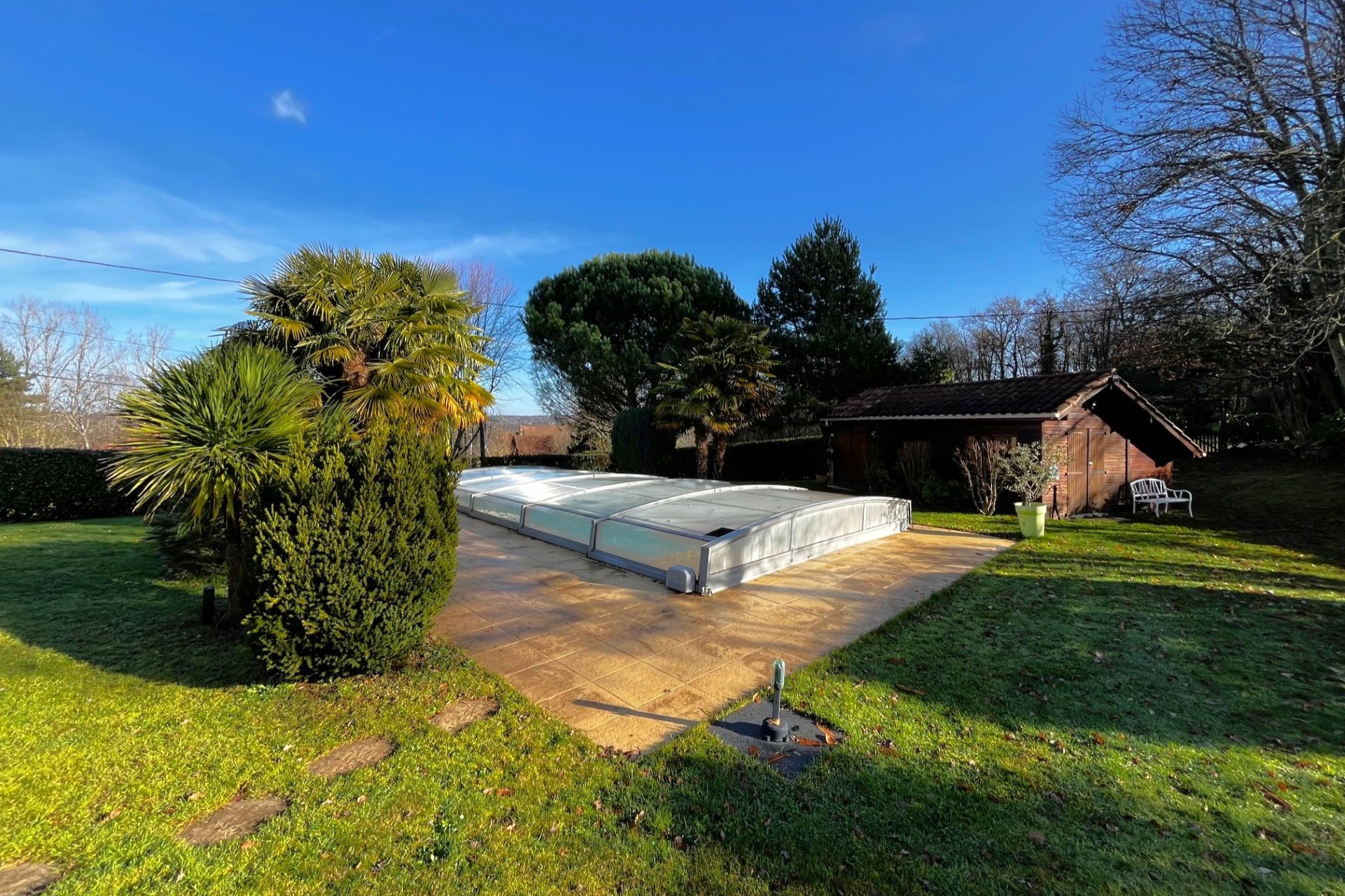Piscine au sel (9 x 4,5m) 1,5 m de profondeur, avec abri de piscine et douche solaire.