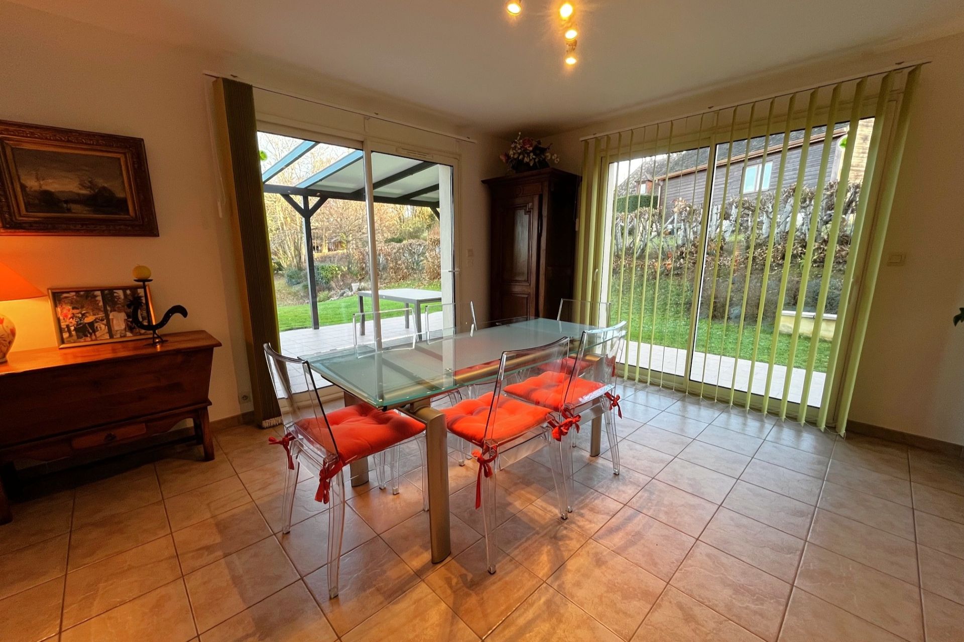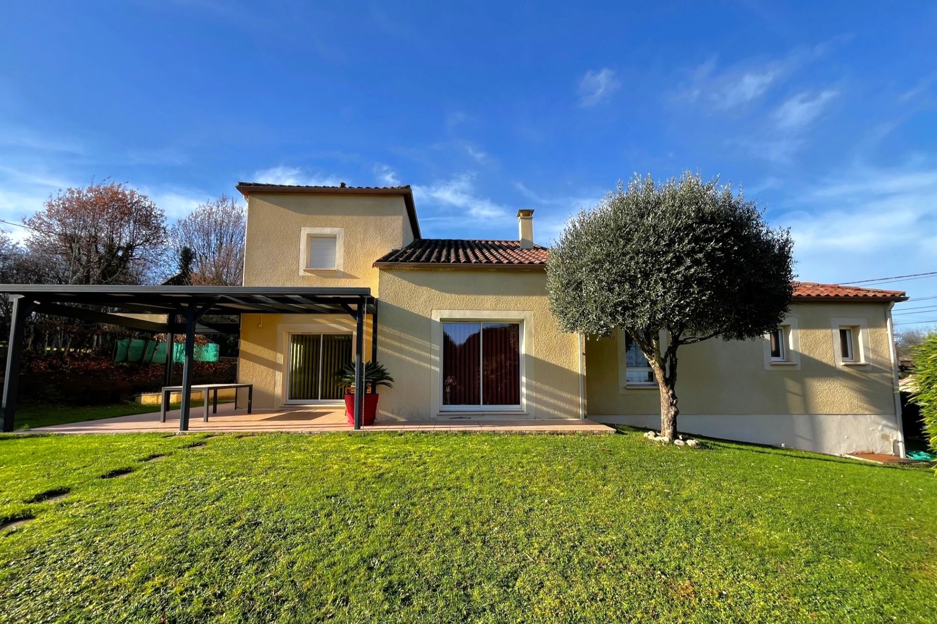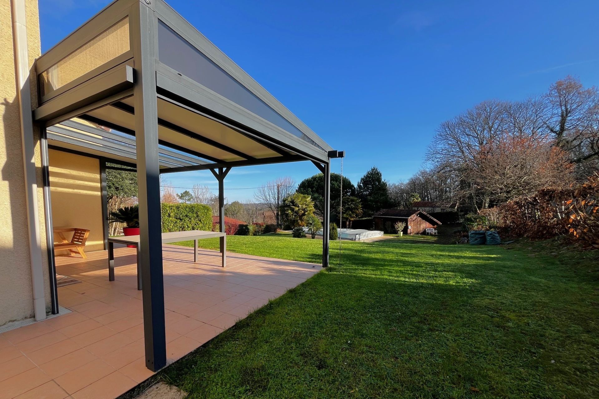 Terrasse carrelée (43,5 m²) avec pergola (25 m²).